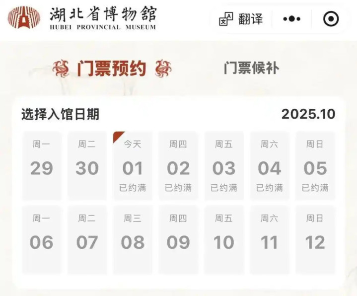 湖北省博物馆10月1日-5日门票约满