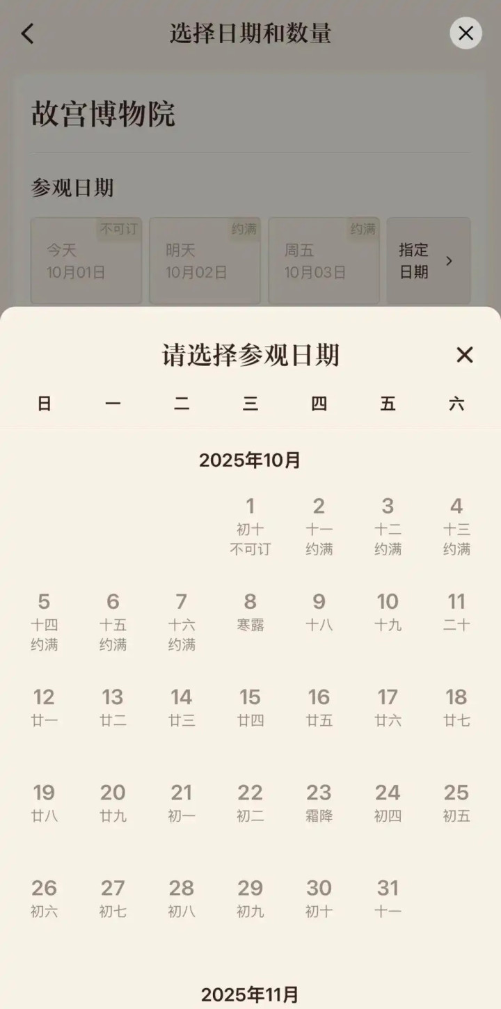 故宫博物院小程序显示,景区10月2日至10月7日均已约满。
